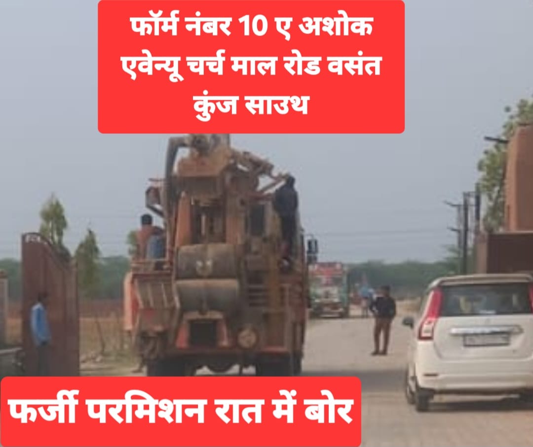 दक्षिणी दिल्ली के फॉर्म नंबर-10A, अशोका एवेन्यू चर्च माल रोड वसंत कुंज थाना वसंत कुंज साउथ में अवैध बोरिंग को लेकर गंभीर मामला सामने आया है। जानकारी के अनुसार फॉर्म नंबर-10A, अशोका एवेन्यू चर्च माल रोड वसंत कुंज , थाना वसंत कुंज साउथ में कथित रूप से बड़ी मशीन के जरिए रात मे बोरिंग का काम किया जा रहा है। बताया जा रहा है कि इस बोरिंग कार्य के लिए न तो कोई वैध लाइसेंस है, न इंश्योरेंस और न ही प्रदूषण से संबंधित आवश्यक अनुमति ली गई है।